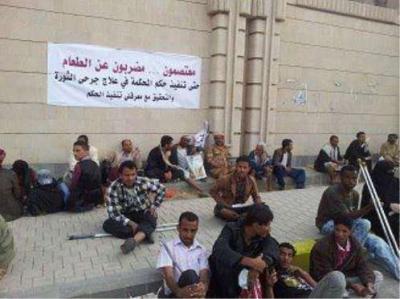 صعدة برس-متابعات - يواصل جرحى الثورة والمتضامنين معهم إضرابهم عن الطعام منذ يوم الثلاثاء أمام مجلس الوزراء ، بسبب مماطلة الحكومة في تسفير عشرة من جرحى الثورة إلى ألمانيا وكوبان تنفيذا للحكم الصادر منتصف نوفمبر الماضي من المحكمة الادارية القاضي بعلاجهم على نفقة الدولة خارج الوطن.