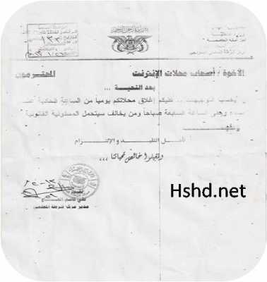 وذلك عقب توجيهات صادرة من الداخلية الى أجهزة الامن وأقسام الشرطة بأمانة العاصمة بإغلاق محلات الانترنت ومتابعتهم يومياً وذلك من الساعة الـ11 مساءً وحتى الساعة الـ7 صباحاً..