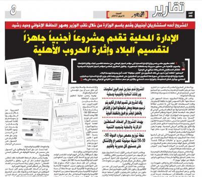 - كشف مشروع مقدم باسم وزارة الإدارة المحلية إلى مؤتمر الحوار الوطني، عن مخطط لتقسيم البلاد وإثارة النزاعات والحروب الأهلية على مستوى مديريات ومحافظات ..