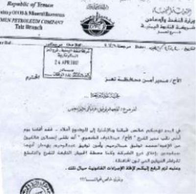 وجاء في الرسالة التي بعثها مدير عام الشركة الى مدير امن تعز حصلت وكالة "خبر" على نسخة منها " ان نائب مدير عام فرع الشركة عبدالتواب الشميري تلقى اتصالان هاتفيان من محمد وامين توفيق عبدالرحيم يهددان انهما سيقومون باغلاق فرع الشركة وكذا محطة الحوبان التابعة للفرع والتقطع للقواطر التي تمون المحافظة .