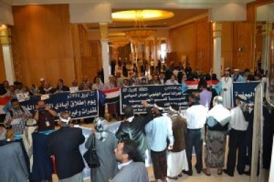 صعدة برس - نفذ ممثلو المحافظات الجنوبية في مؤتمر الحوار الوطني، اليوم بمقر المؤتمر وقفة احتجاجية بمناسبة ما وصفوه بإعلان الحرب على الجنوب في 27 أبريل 94م.