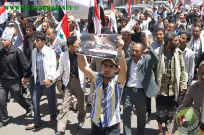 المسيرة طافت شوارع العاصمة صنعاء تلتها وقفة احتجاجية أمام مكتب الأمم المتحدة عدد من الشعارات التي حيت صمود سوريا المقاومة في وجه المؤامرة الكونية التي تقودها الامبريالية الصهيوامريكية ضد هذا القطر العربي الشقيق.ووجه المشاركون البيان ورسائل لكل من الأمم المتحدة وسفيري جمهورية ورسيا الاتحادية والصين الشعبية و الجمهورية الإسلامية الإيرانية في صنعاء.