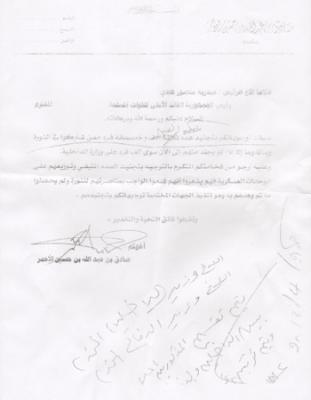 ووجه صادق الاحمر مذكرة الى الرئيس هادي قال فيها " سبق وان وجهت بتجنيد عدد ثلاثة الف وخمسمائة فرد ممن شاركوا في الثورة وساندوها , الا انه لم يجند منهم إلى الان سوى الف فرد فقط على وزارة الداخلية .
