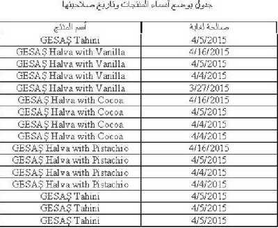 وقالت الجمعية إن هذه المنتجات من إنتاج شركة جيساس (GESAS) التركية وتوزع في عدد من دول العالم بما فيها اليمن ( وذلك وفقا لما نشرته هيئة الغذاء والدواء السعودية ) بناء على الإنذار الصادر من مركز الإنذار السريع للغذاء – الشبكة الدولية للهيئات المعنية بسلامة الغذاء ) والجدول التالي يبين اسم المنتج وتاريخ انتهاء الصلاحية: