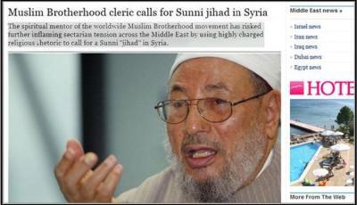 وقالت الصحيفة ان الداعية المصري المتشدد الذي يعيش في قطر، وصف في كلمات مفعمة بالتعصب والكراهية، العلويين، بأنهم أكثر كفرا من النصارى واليهود، داعيا جميع المسلمين في كل الدول العربية للتوجه إلى سوريا.