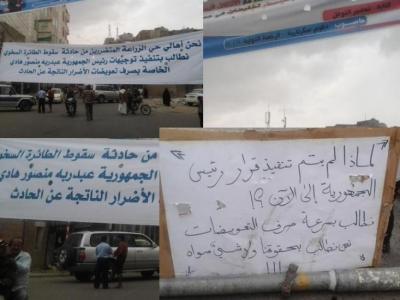 صعدة برس - نظم أبناء حي الزراعة اليوم في صنعاء وقفة احتجاجية تنديدا بمماطلة وزير المالية صخر الوجيه في صرف التعويضات المقررة للمتضررين من حادث سقوط الطائرة سخواي في شهر فبراير من العام الجاري والتي خلفت العديد من القتلى والجرحى إضافة إلى خسائر مادية جسيمة .