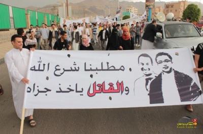 صعدة برس-متابعات - خرجت عصر اليوم الجمعة في العاصمة صنعاء مسيرة حاشدة شارك فيها ناشطين والمئات من شباب الثورة، تضامنا مع أسرتي الشهيدين أمان وخطيب، اللذان قتلا في شهر مايو الماضي برصاص مسلحين قبليين يتبعون القيادي في تجمع الإصلاح الشيخ علي عبد ربه العواضي.