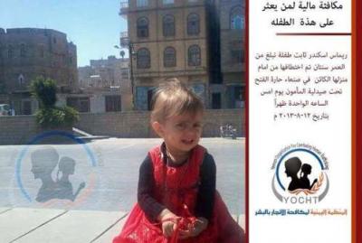 صعدة برس-متابعات - حذرت المنظمة اليمنية لمكافحة الاتجار بالبشر من تنامي ظاهرة اختطاف الاطفال .. وكشفت المنظمة عن اختطاف الطفلة ( ريماس اسكندر ) في احد إحياء العاصمة صنعاء .