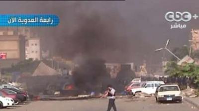 وأظهرت لقطات تلفزيونية قيام قوات الأمن المصرية بإطلاق قنابل الغاز المسيل للدموع لتفريق المعتصمين في رابعة العدوية والنهضة. وعملت جرافات تابعة للأمن على إزالة الحواجز في محيط الاعتصامين.