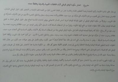 مشروع النص المعنون بـ«اعتذار حكومة الوفاق لأبناء المحافظات الجنوبية والشرقية ومحافظة صعدة»، دعا الأطراف السياسية والمجتمعية والفعاليات الدينية والثقافية والفكرية إلى دعم مصالحة وطنية شاملة تعيد للمجتمع لحمته الوطنية وتنشر روح التسامح والقبول بالآخر.