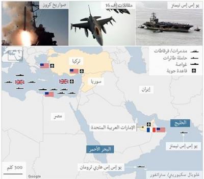 أمس الثلاثاء؛ نقل موقع "بي بي سي" عن "غلوبال سيكوريتي" جرافيك يوضح تمركز حاملة الطائرات الأمريكية "يو إس إس هاري ترومان" بالقرب من سقطرى، في وضعية استعداد قتالية للمشاركة في الحرب الوشيكة التي تعتزم شنها الولايات المتحدة الأمريكية وحلفاؤها ضد سوريا.