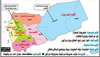 وقال المصدر ان أهم ملامح مقترح تقسيم اليمن الى أربعة أقاليم تتكون من التالي: إقليم المنطقة الشرقية, ويضم حضرموت والمهرة وجزاء من شبوة, وإقليم المنطقة الجنوبية, ويضم عدن ولحج وأبين والضالع وتعز وإب, وإقليم المنطقة الشمالية, ويضم صنعاء وعمران وصعدة وحجة والحديدة والبيضاء وريمة, وإقليم المنطقة الوسطى, ويضم مأرب والجوف ونصف شبوة وجزاء من أبين, وستكون, وفقاً لهذا المقترح, أمانة العاصمة مركزاً لقيادة دولة الأقاليم, وسيستكملون هذا المقترح وتحديد الأسماء وتوزيع المحافظات فيه".