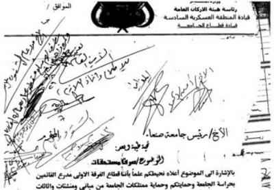 وحصل " براقش نت " على وثيقة رسمية عبارة عن رسالة رسمية من قيادة المنطقة العسكرية السابعة , لكنها تتحدث ان الفرقة الاولى مدرع تحمي الجامعة , وتحمي المسؤولين في الجامعة , وتطالب بصرف مكافأت مالية نظير خدماتهم المستمرة . |