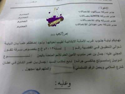 والمذكرة الصادرة من محكمة غرب امانة العاصمة الى شركات الاتصالات تفيد بتلقيها بلاغا رسميا عن سرقة تلفون تابع لمكتب جمال بن عمر الكائن في عطان شارع السلامي .