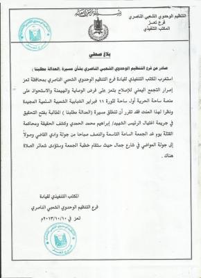صادر عن فرع التنظيم الوحدوي الشعبي الناصري بشأن مسيرة (العدالة مطلبنا )