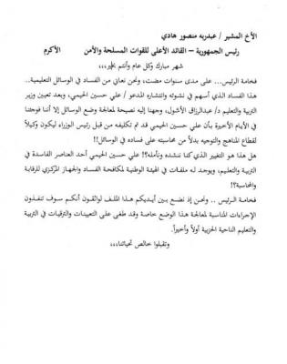 - فخامة الرئيس... على مدى سنوات مضت، ونحن نعاني من الفساد في الوسائل التعليمية.. هذا الفساد الذي أسهم في نشوئه وانتشاره المدعو / علي حسين الحيمي، وبعد تعيين وزير التربية والتعليم د/ عبدالرزاق الأشول، وجهنا إليه نصيحة لمعالجة وضع الوسائل إلا أننا فوجئنا في الأيام الأخيرة بأن علي حسين الحيمي قد تم تكليفه من قبل رئيس الوزراء ليكون وكيلاً لقطاع المناهج والتوجيه بدلاً من محاسبته على فساده في الوسائل!!