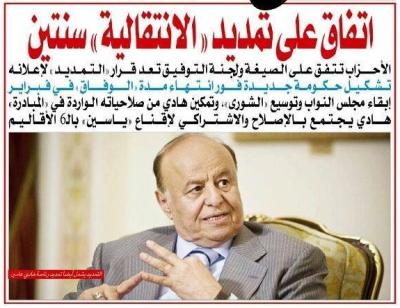وكشفت مصادر وثيقة الصلة لـ"الأولى" أن أمس الاثنين وأمس الأول الأحد, شهدا اجتماعين حاسمين للجنة التوفيق في "مؤتمر الحوار" وافق خلالهما ممثلو الرئيس هادي والمؤتمر الشعبي العام والإصلاح والاشتراكي والناصري وقوى أخرى, على صيغة التمديد لمدة عامين, مع حزمة من الإجراءات السياسية المصاحبة فيما سجل الاجتماعان تحفظا وحيدا من قبل تيار "أنصار الله" (الحوثيين).