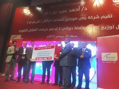 صعدة برس-متابعات - وزعت شركة (يمن موبايل) صباح اليوم بصنعاء في حفل كبير (31) مليون ريال لعدد من مراكز الفشل الكلوي في أمانة العاصمة وعدد من محافظات الجمهورية حصيلة عائدات حملة دوائي 2 التي اطلقتها الشركة في رمضان الماضي تحت شعار (اشحن رصيدك حسنات).