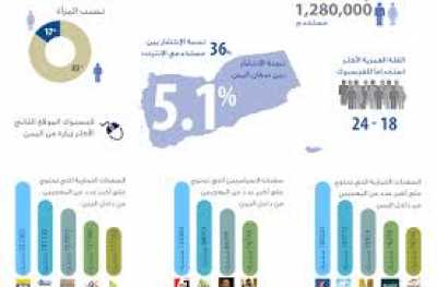 وقد أظهرتقريرانه تضاعف عدد مستخدمي الفيسبوك من اليمن حيث وصل العدد إلى 1,280,000 أكثر أي ما يقارب 5.1% من إجمالي عدد السكان في اليمن.