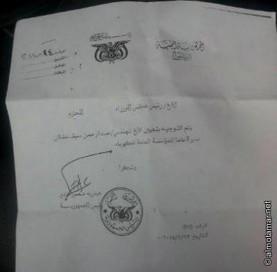 وحصل (المؤتمرنت) على (وثيقة ) تتضمن توجيه رئاسي بتعيين المهندس عقلان مديرا عاما للمؤسسة العامة للكهرباء . وسارع وزير الكهرباء صالح سميع لاستصدار قرار تعيين مخالف لتوجيهات رئيس الجمهورية .