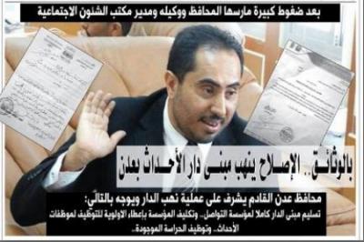 وتأكدت " صحيفة القضية " من صحة المحاضر والوثائق التي تؤكد حقيقة وصحة ما ذهبت اليه السيدة انتصار الدالي رئيسة المركز بعد ان قام وكيل المحافظة بتزوير توقيعات محاضر الاجتماع والادعاء زورا وبهتانا بان الدالي وقعت محضر اتفاق بتسليم الدار المؤسسة في ظاهرة تزوير مفضوحة وباينه للعيان وذلك ضمن مساعي مسؤولي الاصلاح للاستيلاء على ما تبقى من مؤسسات الدولة وتصفيتها لصالح الحزب وجماعاتهم الاخوانية المنبوذة في اوساط اهالي المدينة المنكوبة .