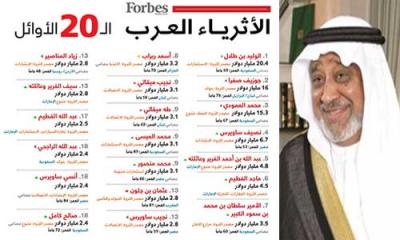 وتصدر القائمة الوليد بن طلال، بثروة تقدر بـ 20.4 مليار دولار. ويأتي في المرتبة الـ2 البرازيلي من أصل لبناني جوزيف صفرا بثروة تبلغ 16 مليار دولار، يليه السعودي من أصل حضرمي محمد العمودي بثروة تبلغ 15.3 مليار دولار.
