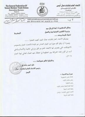 وكان الاتحاد العام لنقابات عمال اليمن، ابلغ اليوم الثلاثاء، حكومة الوفاق إلغائه للشراكة معها، بسبب ما ترتكبه من انتهاكات بحق عمال اليمن.
