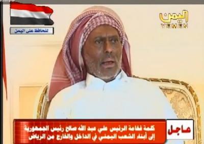 حيا فخامة الرئيس علي عبدالله صالح رئيس الجمهورية في خطاب بث عبر التلفزيون من المستشفى الذي يعالج فيه في الرياض الشعب اليمني في داخل اليمن وخارجه على صموده في وجه التحديات ومواجهة التحدي بالتحدي .