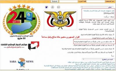 طالبنا في تقرير سابق وزير الشباب والرياضة اليمني الأستاذ/ معمر الإرياني بالوقوف بحزم تجاه ما يقوم به قطاع الرياضة بالوزارة بقيادة الوكيل المساعد للقطاع خالد صالح حسين بالتحكم وفرض نفوذه وسيطرته على عدد من الاتحادات الرياضية اليمنية عن طريق زرع من يعملون لديه بالقطاع في قيادة تلك الاتحادات ... فوجئنا بصدور القرار الجمهوري رقم (79) لسنة 2014م والمنشور في موقع وكالة الأنباء اليمنية (سبأ) بتاريخ 19/5/2014م والذي قضى بتعيينات وتغييرات في وزارة الشباب والرياضة وكان من ضمن المعينين الوكيل المساعد لقطاع الرياضة خالد صالح حسين وبنفس المنصب الذي يشغله من قبل.. فهل يعتبر هذا التعيين والقرار مكافأة لارتكاب خالد صالح المخالفات حيث انه كان مكلف فقط بعمل الوكيل المساعد لقطاع الرياضة ولم يكن قد صدر قرار جمهوري بتعيينه سابقاً.