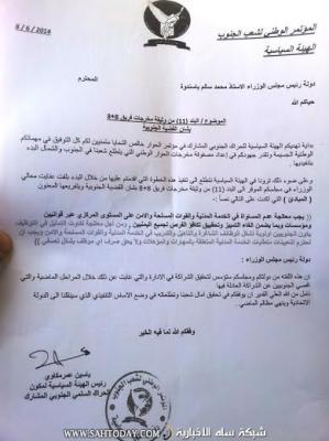 وأوضحت المصادر ذاتها أن اعتراض وزير الإعلام على قرار مساواة أبناء الجنوب بإخوانهم في الشمال وتنكره لمخرجات الحوار الوطني الذي كان أحد أعضائه، قد قوبلت بحالة استياء واستنكار واسعين من قبل بقية وزراء حكومة الوفاق اللذين حضروا في الجلسة، معتبرين أن اعتراض مصطفى يأتي كنوع من ردة فعله على قرار إزاحته من مكتب رئاسة الجمهورية. وفق تعبير المصادر ذاتها.