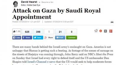 يحمل مقال هيرست المنشور، اليوم الإثنين، في "ميدل إيست آي" والذي بدأت صحف أخرى تتداوله، عنوان "حرب إسرائيل على غزة جاءت بتكليف سعودي"، ويقول فيه: "هناك أياد كثيرة تقف وراء المجزرة الإسرائيلية في غزة، فأمريكا لا تشعر بالاستياء من الضرب الذي تتعرض له حماس... ولا مصر التي حمل وزير خارجيتها حماس مسؤولية سقوط مدنيين بسبب رفضها المبادرة المصرية"، قبل أن يصل إلى النقطة الجوهرية: "العدوان على غزة جاء بتكليف ملكي سعودي. وهذا التكليف يعدّ سراً علانياً في إسرائيل، والمسؤولون الحاليون والسابقون في وزارة الدفاع الإسرائيلية يشعرون بالاسترخاء حين يتكلمون عنه. وقد فاجأ وزير الدفاع الإسرائيلي السابق شاوول موفاز المذيع الذي يقابله عبر القناة الإسرائيلية العاشرة، بالقول إن على إسرائيل أن تحدد دوراً للسعودية والإمارات في نزع سلاح حماس، وحين سئل عن توضيح كلامه قال إن على هذين البلدين أن يعيدا بناء غزة بعد القضاء على حماس".