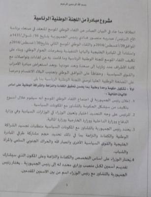 انطلاقا مما جاء في البيان الصادر عن اللقاء الوطني الموسع المنعقد في صنعاء برئاسة الأخ الرئيس عبد ربه منصور هادي رئيس الجمهورية بتاريخ 16 شوال 1435م الموافق 20 أغسطس 2014م واللقاء الوطني الموسع الثاني بتاريخ 30 أغسطس 2014م واستنادا إلى المبادرة الخليجية وآليتها التنفيذية ومخرجات الحوار الوطني، وبناء على تكليف اللقاء الموسع للجنة الوطنية الرئاسية وما قامت به من لقاءات وتواصلات مع كافة الأطراف عند زيارتها إلى صعدة وبعد عودتها، وبعد استعراض مبادرة الأحزاب والقوى السياسية، وحفاظا على التوافق الوطني وتجنيب البلاد الانقسام وحرصا على المصلحة الوطنية العليا توصي اللجنة الوطنية الرئاسية بما يلي: