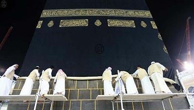 صعدة برس-متابعات - قامت الرئاسة العامة لشؤون المسجد الحرام والمسجد النبوي برفع الجزء السفلي من كسوة الكعبة المشرفة بمقدار (3) ثلاثة أمتار تقريباً ويتم تغطية الجزء المرفوع بإزار من القماش القطني الأبيض بعرض مترين تقريباً من الجهات الأربع , جرياً على العادة السنوية وحسب الخطة المعتمدة لموسم الحج لهذا العام1435هـ