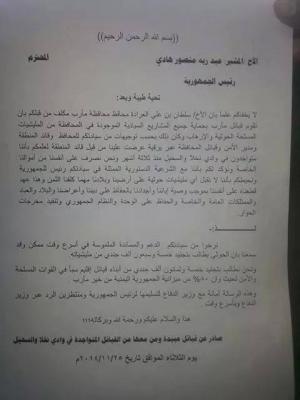 وجاء في الرسالة الموجهة للرئيس: "لا يخفاكم أن الأخ سلطان بن علي العرادة، محافظ محافظة مأرب، مكلف من قبلكم بأن تقوم قبائل مأرب بحماية جميع المشاريع السيادية الموجودة في المحافظة، من المليشيات المسلحة الحوثية والإرهاب، وكان ذلك بحسب توجيهات من سيادتكم للمحافظ وقائد المنطقة ومدير الأمن وقبائل المحافظة، عبر برقية عرضت علينا من قبل قائد المنطقة".