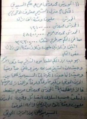 صعدة برس-متابعات - كشفت وثيقة تحكيم عبد الملك الحوثي للشيخ صادق بمبلغ 32.300.000 وذلك بعد رد الشيخ صادق الاحمر الحكم لعبد الملك الحوثي للحكم على نفسه. ويظهر في الوثيقة المحدش وهو 1.100.000 والمحدش محدوش وهو12.100.000والمحدش محدوش مربع وهو 48.400.000 ريال يمني وصافي الحكم بعد خصم الثلث يساوي 32.3000.000. وتوضح الوثيقة بأن هذا الحكم هو بموجب رد الحكم إلى عبد الملك الحوثي وهذا الحكم أنما هو حسب أسلاف وأعراف القبائل. كما أشارت الوثيقة إلى مدح الشيخ عبد الله الأحمر ووصفة بالرمز الوطني حياً وميتاً وإنما حدث فإن عبد الملك يكرهه وهو منكر شرعاً وعرفاً وأن للمنازل حرمتها. |