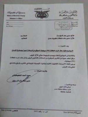 ومن بين الوثائق الرسمية التي نشرتها "خبر" للأنباء، رسالة موجهة من وزارة الكهرباء، إلى فرع المؤسسة العامة للكهرباء في عدن، تقضي بإنهاء عقد شراء الطاقة 90 ميجاوات الموقع من شركة دوم ومصادرة الضمان.