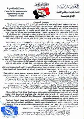 عبر اتحاد نقابات موظفي الجهاز الإداري للدولة عن بالغ أسفه لما تمر به بلادنا من متغيرات أخرجت العملية السياسية عن مسارها الصحيح الذي اختاره وأجمع عليه شعبنا اليمني الأبي، والمتمثل في المبادرة الخليجية وآليتها التنفيذية وما أفضت إليه هذه العملية من حوار وطني شامل وضعت على طاولته خلافات كل الفرقاء ومشاكل كل الوطن، وما تلا ذلك من توقيع لاتفاق السلم والشراكة وملحقها الأمني المبني على المبادرة الخليجية وآليتها التنفيذية ومخرجات الحوار الوطني والتي تعتبر الطريق الذي لا مناص منه لحل كل إشكالات الوطن الذي يتسع لكل أبنائه.