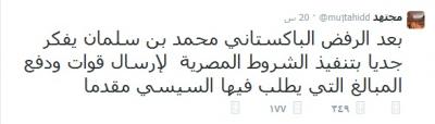 صعدة برس -متابعات - قال المغرد السعودي الشهير، مجتهد، إن الرفض الباكستاني، للمشاركة في عاصفة الحزم، في اليمن، دفعت بـ"محمد بن سلمان" وزير الدفاع السعودي، إلى التفكير جديا بتنفيذ الشروط المصرية لإرسال قوات للمشاركة في عاصفة الحزم في اليمن.