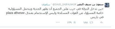 و قال الامير سعود بن سيف النصر، في تغريدة على حسابه في "تويتر": "حين تدخل الدولة في حرب، على الجميع أن يظهر الجدية و يتحمل المسؤولية. خاصة المسؤول عن القوات المسلحة و ليس الاستجمام بفندق plaza atheneeفي باريس".