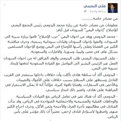 و حسب منشور البخيتي، في صفحته في الفيسبوك، طلب اليدومي، على المستوى اليمني، من إخوان السودان العمل عبر الرئيس البشير إلى التواصل مع القيادة السعودية لدفعها لإيجاد تسوية في اليمن.