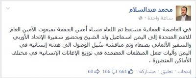 و أوضح أن اللقاء تم بينه و بمبعوث الأمين العام للأمم المتحدة إلى اليمن، إسماعيل ولد الشيخ أحمد، و بحضور سفيرة الإتحاد الأوربي و السفير الألماني بصنعاء.