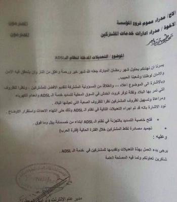 و بموجب المذكرة وجه مدير عام إدارة الانترنت وتبادل المعطيات في المؤسسة مدراء فروع المؤسسة في المحافظة، بفتح خاصية التسديد بالتجزئة في نظام DSILإبتداءا من 500 ريال و ما فوق، فضلا عن عدم مصادرة نقاط المشتركين خلال الفترة الحالية (فترة الحرب).