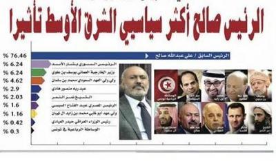 صعدة برس-متابعات - في استبيان يجريه راديو سوا الأمريكي يتصدر رئيس الجمهورية السابق –رئيس المؤتمر الشعبي العام – الزعيم علي عبدالله صالح قائمة الشخصيات السياسية الأكثر تأثيراً في الشرق الأوسط خلال العام ٢٠١٥م..