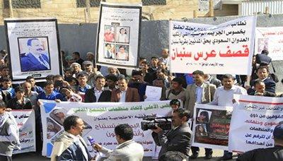 ورفع المشاركون في الوقفة الجماهيرية التي تزامنت مع وصول المبعوث اﻷممي إلى اليمن إسماعيل ولد شيخ أحمد أمس صورمن جرائم اﻹبادة الجماعية التي ارتكبها طيران العدوان السعودي في العديد من المحافظات منها مجزرة العرس في سنبان بمحافظة ذمار وتدمير المعاهد الفنية والتقنية والمنشآت الاقتصادية والزراعية، واستهداف العدوان لمركز النور لتأهيل المكفوفين بالعاصمة صنعاء والتي تعتبر جريمة بحق اﻹنسانية وانتهاكا صارخا لمواثيق اﻷمم المتحدة واتفاقياتها، مطالبين بتقديم مرتكبي تلك الجرائم إلى المحكمة الجنائية الدولية.
