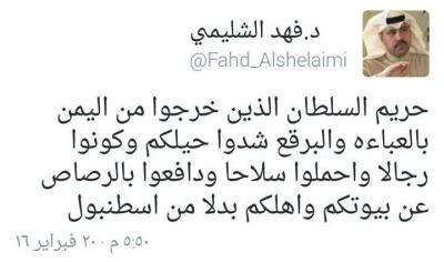 وقال العقيد ركن فهد الشليمي والذي يعد من اكبر داعمي العدوان على اليمن، ان قيادات الاخوان وقيادات المرتزقة الذين يقيمون في الخارج هم عبارة عن حريم السلطان، الذي يتفرج على المعارك،من فنادق اسطنبول، داعيا في نفس الوقت هذه القيادات، لترك الفنادق والملاهي،والرجوع الى اليمن ومشاركة قوات العدوان.