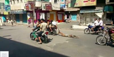 ونشر ناشطون على مواقع التواصل الاجتماعي، صورة لسحل مواطن خلف دراجة نارية غرب مدينة تعز، جنوب غرب البلاد.