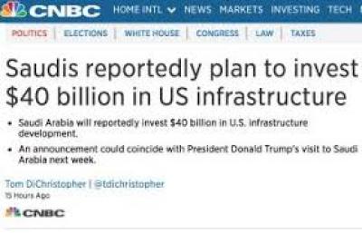 قالت شبكة (CNBC) الإخبارية الأمريكية أن السعودية تخطذط لإستثمار 40 مليار دولار لتطوير البنية التحتية الأمريكية، مشيرة إلى أن الإعلان عن ذلك سيتزامن مع زيارة الرئيس الأمريكي دونالد ترامب إلى السعودية الأسبوع المقبل.