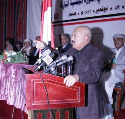 اقول بهذه المناسبة الوطنية الغالية يوم جلاء اخر مستعمر بريطاني من ارضنا الطيبة الطاهرة احيي اولئك الشهداء لثورة سبتمبر واكتوبر واحيي اولئك الشهداء والجرحى الذين يصدون العدوان ويدافعون في الجوف في صعدة في ميدي في حرض في تعز في عدن في لحج في ابين في حضرموت في مارب في شبوة احيي اولئك الشهداء ونتمنى الشفاء العاجل للجرحى ونتمنى الثبات لكل ابناء الوطن، وادعو المؤسسات الاعلامية التابعة للمؤتمر ان تبتعد عن المناكفات الاعلامية ومردود على من يسيى اليها، ابتعدوا تماما خلو اولئك يشتموكم وساما على صدوركم ما يرموا الا الشجرة المثمرة اما الشجرة اليابسة لا أحد يرميها، انتم حزب الوطن، امل الشعب عليكم وانتم ابناء الشعب، الذي يتخيلوا أن صالح يشتي السلطة، السلطة تركتها في 2011/ 2012 احمد علي عيجي احمد علي خطر، احمد علي خرج، احمد علي دخل، شغله، لو كنا حق سلطة كانت في ايدينا وكنا حسمناها، باقل الخسائر ولا واحد في المائة من خسائر الشعب اليوم اقتصاديا وسياسيا وعسكريا، كان حسمناها، لا نريد السلطة لكن سندافع عن الوطن سنوقف مع كل الشرفاء والى جانب كل المقاتلين الذين يدافعون عن التربة اليمنية سنوقف معهم