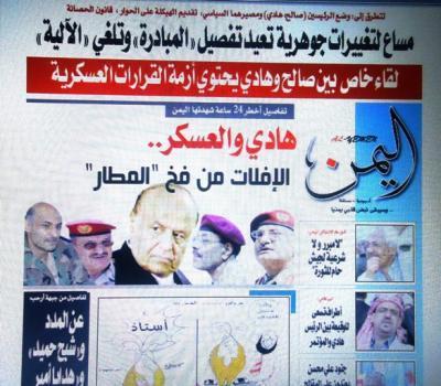.. كشفت صحيفة "اليمن" في عددها الصادر اليوم الإثنين عن مساع تبذلها أطراف يمنية لإقناع الرعاة الإقليميين والدوليين بإعادة النظر في مضمون المبادرة والخليجية وبما من شأنه إعادة تفصيل الاتفاق السياسي فيما تمس التغييرات والإضافات المفترضة روح المبادرة وتتطرق إلى ترتيبات ملزمة حول وضع ومصير الرئيسين صالح وهادي ومستقبلهما السياسي والحزبي, إضافة إلى تغييرات جوهرية على الآلية التنفيذية المزمنة تكاد أن تأت عليها في المحصلة الأخيرة وتلغي جدول الآلية المزمنة. فيما كشفت مصادر الصحيفة عن اضطلاع مراكز إقليمية بدور داعم ومحرض للأطراف المرتبطة بها في الداخل اليمني باتجاه الدفع نحو تغيير في معادلة التسوية؛ سعيا إلى تمرير برامج ومصالح مشتركة - مرتبة بشكل مسبق وبصورة ثنائية مع أطراف حليفة في الحياة السياسية اليمنية - تتصادم مع معايير وتبعات المبادرة والآلية في شكلها الحالي.