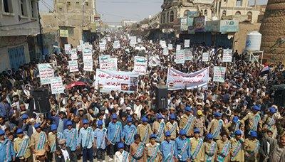 وفي المسيرة التي شاركت فيها حشود من أبناء مختلف مديريات المحافظة تقدمها العلماء و الشخصيات الإجتماعية والثقافية ، تعالت الهتافات الغاضبة تجاه الجرائم التي يرتكبها العدوان الأمريكي السعودي ومرتزقته بحق الشعب اليمني .